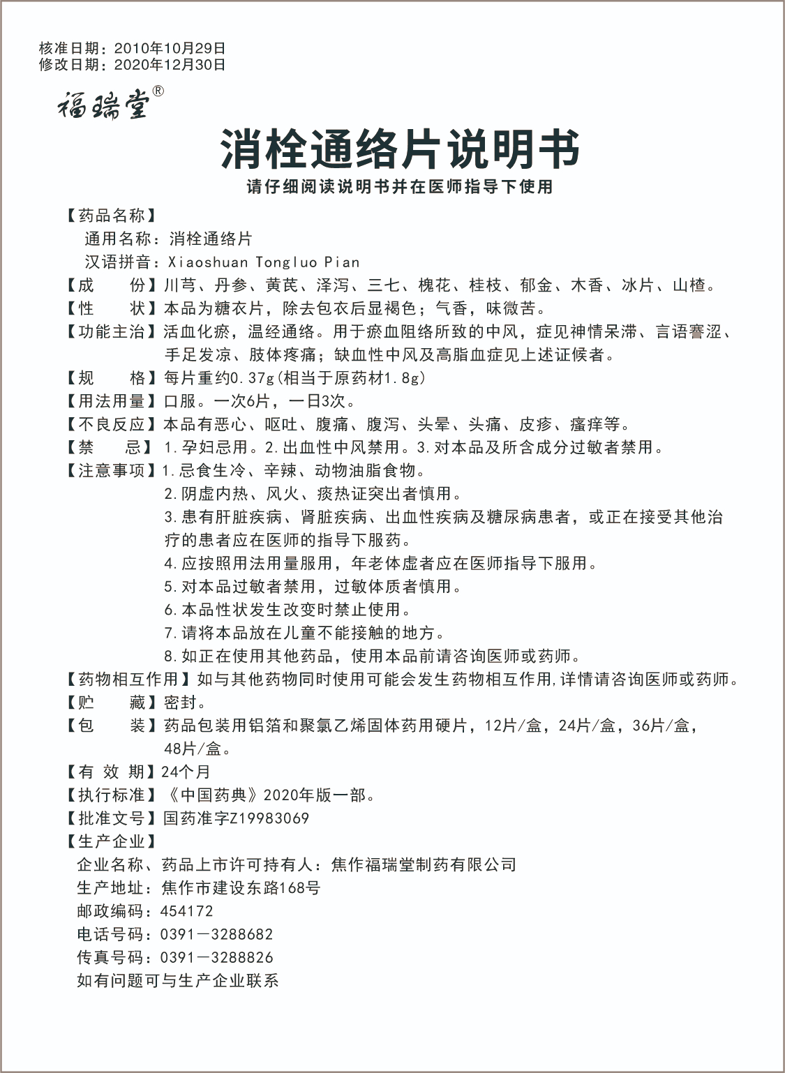 消栓通络片 (12片)说明书