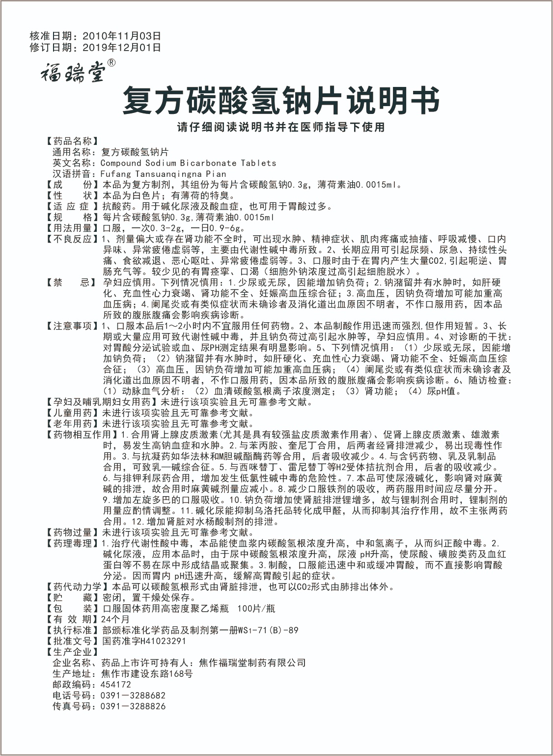 复方碳酸氢钠片(100片)说明书