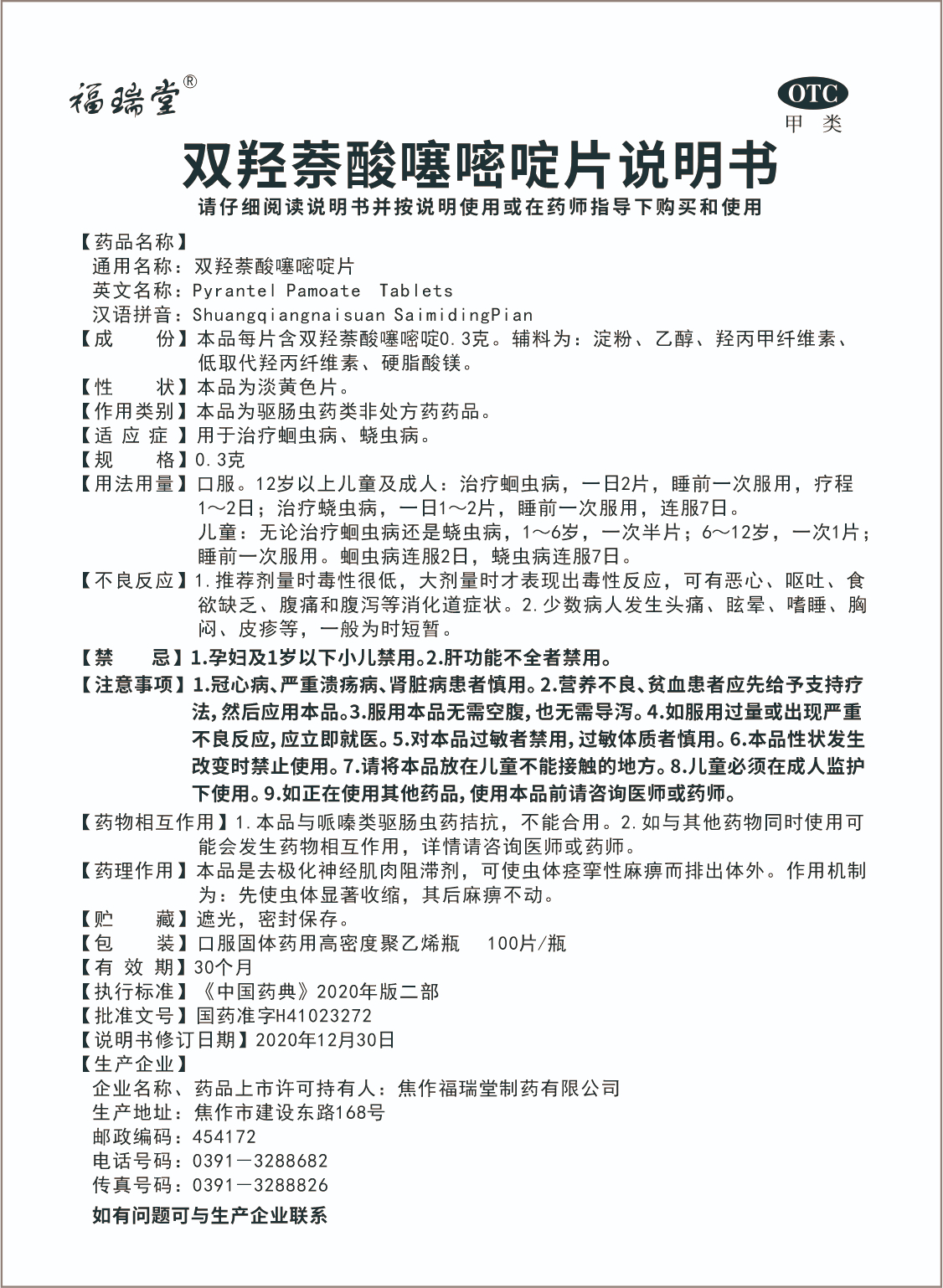 双羟萘酸噻嘧啶片(100片)说明书