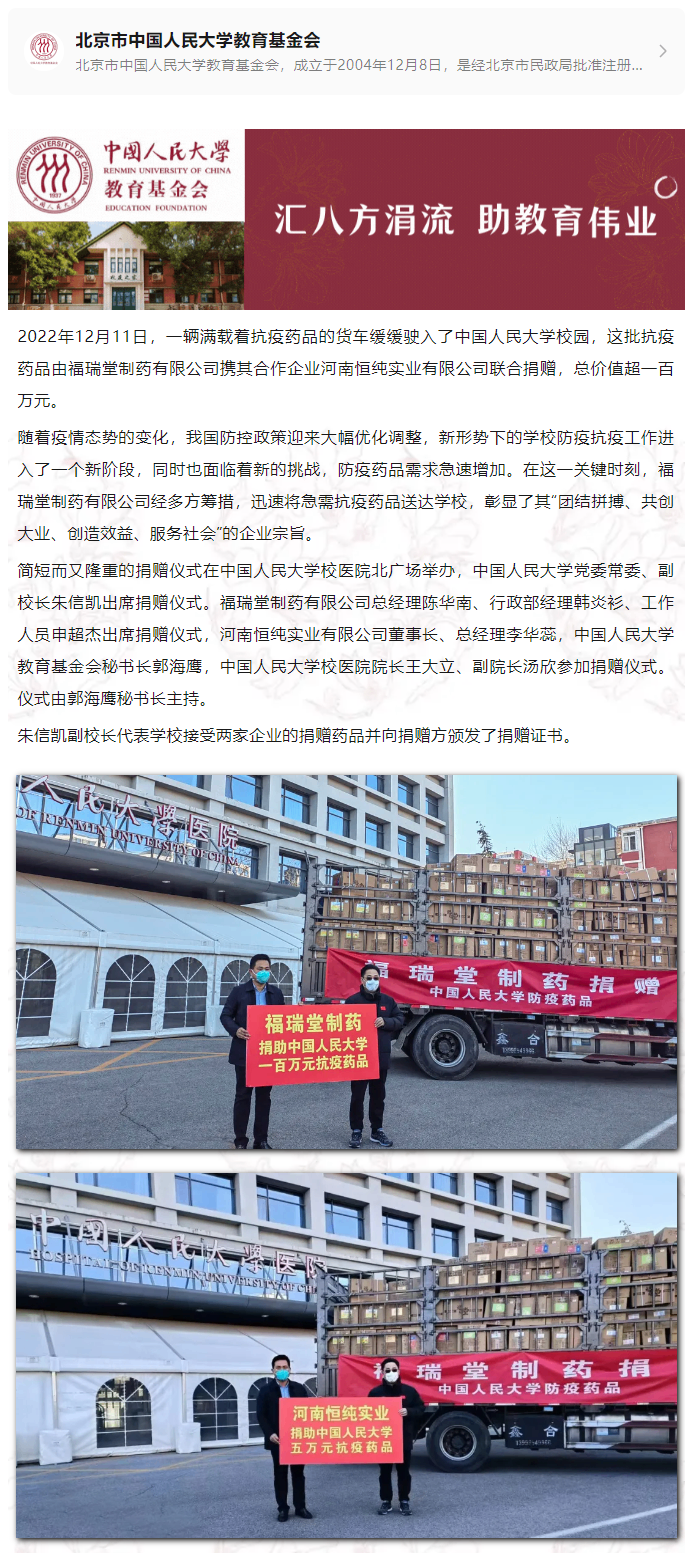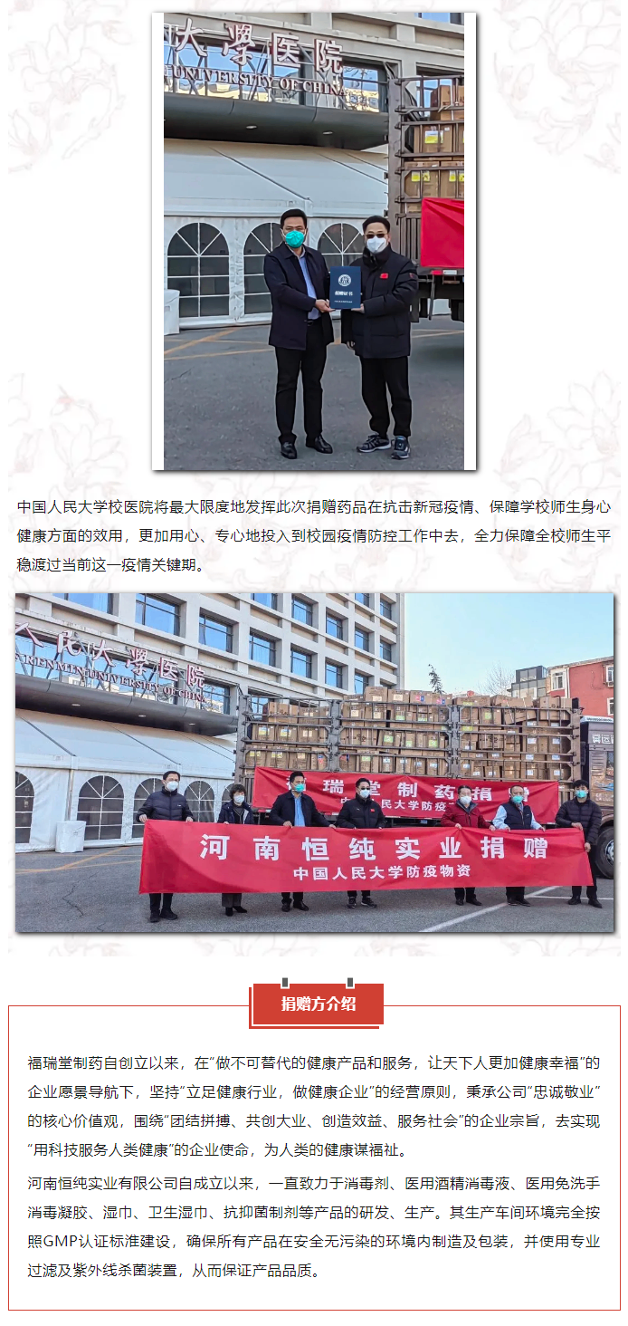 福瑞堂制药、河南恒纯实业向中国人民大学联合捐赠百万元抗疫药品