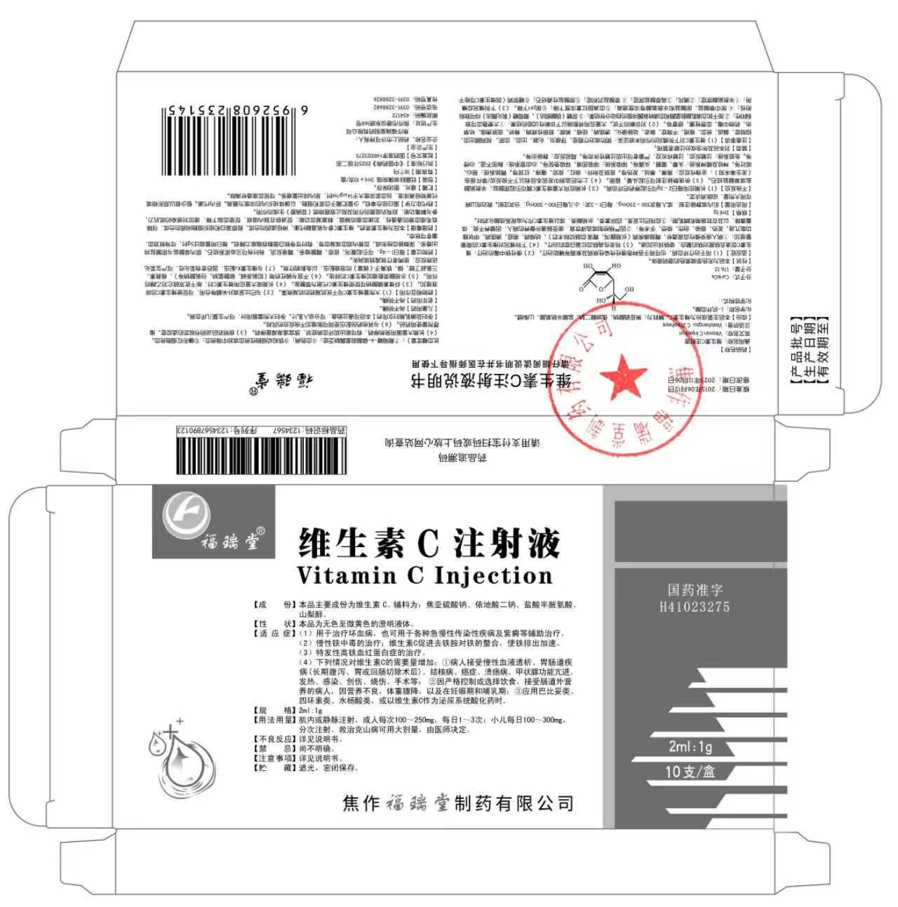 3.维生素C注射液(批准文号:国药准字H41023275,规格:2ml:1g)
