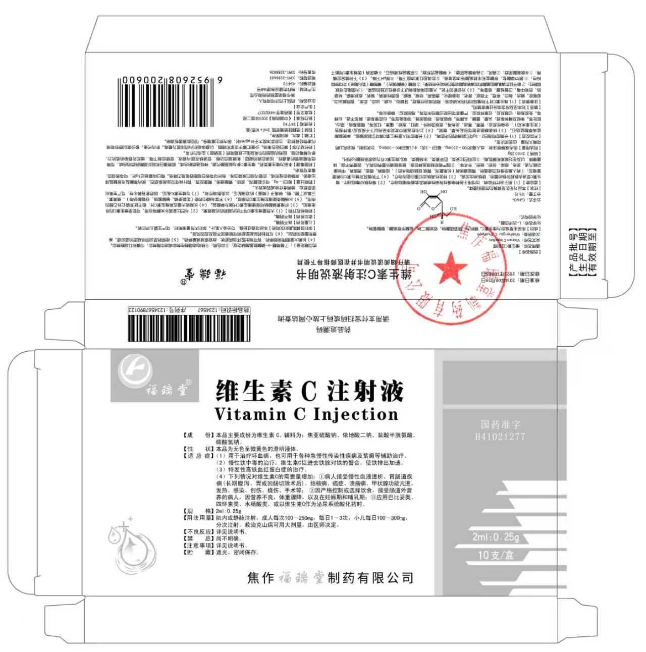 1.维生素C注射液(批准文号:国药准字H41021277,规格:2ml:0.25g)