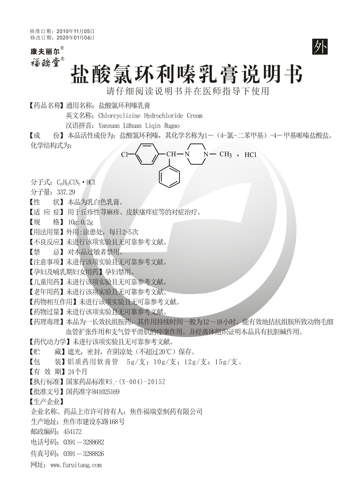 通用名称:盐酸氯环利嗪乳膏