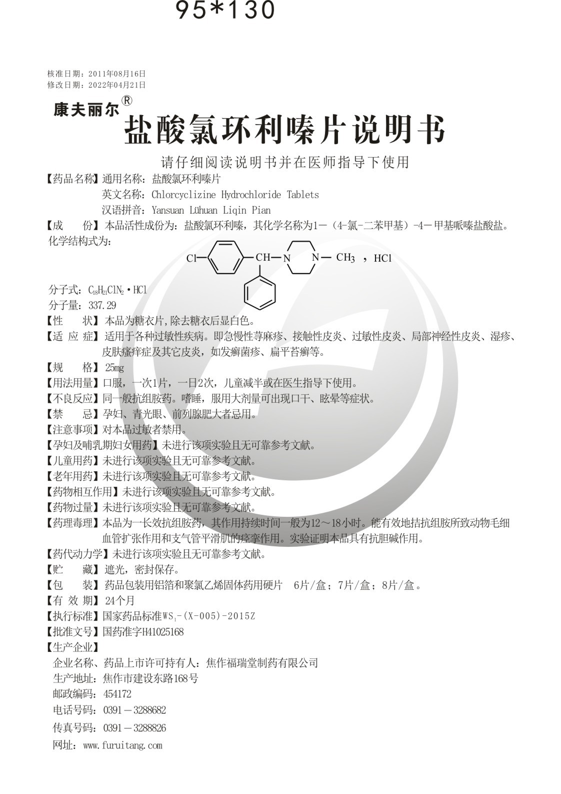 英文名称:Chlorcyclizine Hydrochloride Tablets