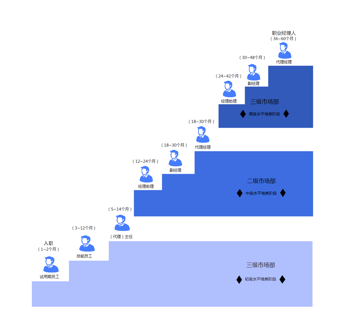 根据员工发展的阶段和特点,分别制定培养训练方案,依据训练成绩,实行晋升;最终将员工培养成职业经理人。
