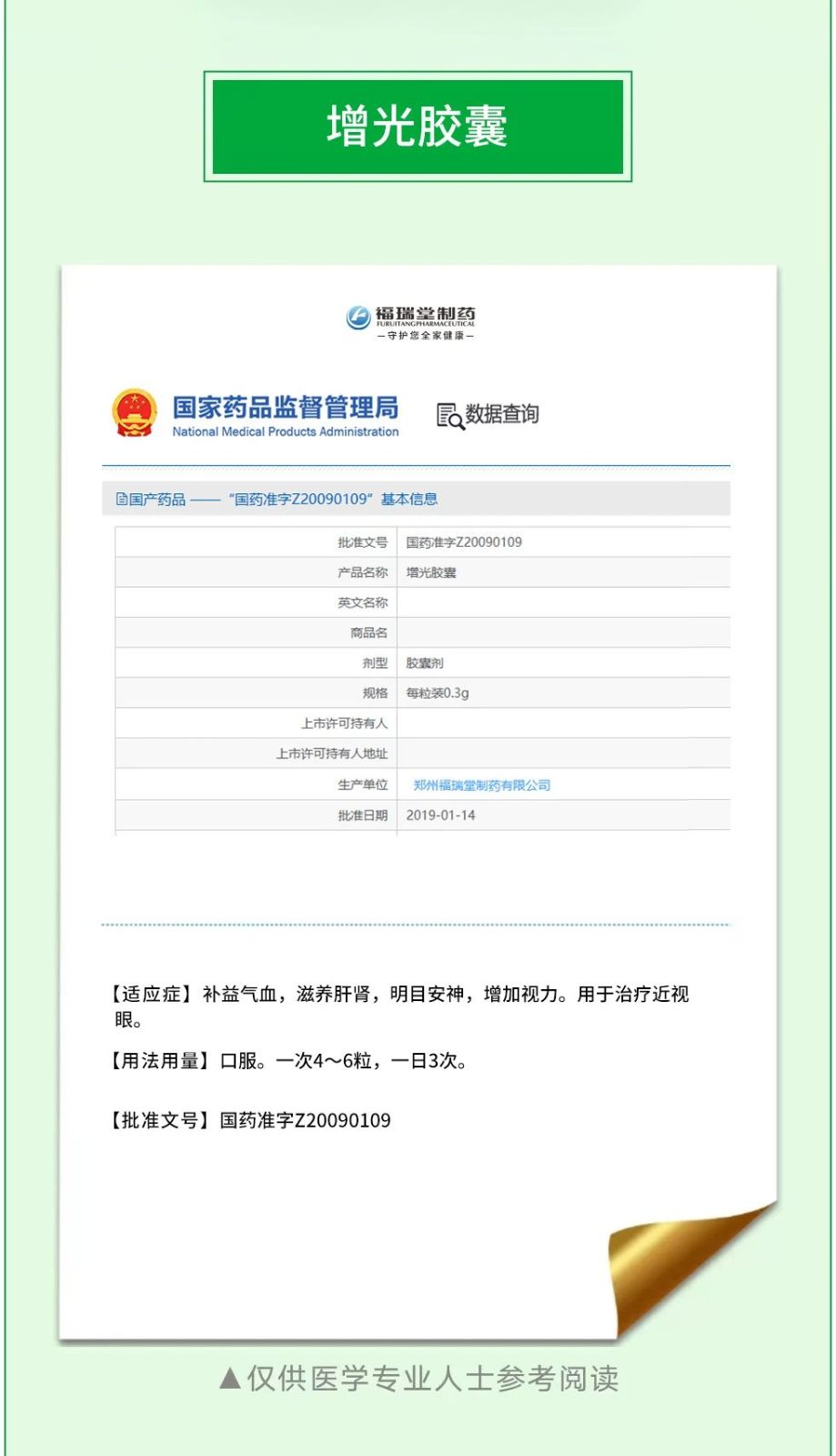 福瑞堂制药作为郑州市高新技术企业,其中一款全新中药治疗近视产品--福瑞堂增光胶囊2009年获得国家药监局批准,国药准字Z20090109,增光胶囊由党参、当归、枸杞子、茯苓、麦冬、泽泻、五味子、石菖蒲、牡丹皮、远志(甘草水制)等10味中药材精心炮制而成,国家药监局明确批示功能主治:补益气血,滋养肝肾,明目安神,增加视力。用于治疗近视眼。《临床医药文献电子杂志》2019年第6卷第71期 由湖南省常德市澧县中医院孙军主导的增光胶囊在近视患者中的临床治疗效果及对药物安全性、视力的影响研究 一文中得出结论:增光胶囊在近视患者中得到应用,且效果理想。增光胶囊属于中成药物,临床使用时药物本研究中,两组治疗前裸眼视力、屈光度及眼轴长度比较差异无统计学意义(p>0.05):观察组治疗后裸眼视力、眼轴长度,高于对照组(p<0.05);观察组治疗后1年屈光度,低于对照组(p<0.05),说明增光胶囊用于近视患者中能获得良好的治疗效果,有助于提高患者视力,降低屈光度,利于患者康复。增光胶囊是近视患者中常用的治疗药物。方药由当参、泽泻、当归、枸杞子、茯苓、麦冬、石菖蒲、牡丹皮、五味子、远志(甘草水制)组成。增光胶囊由于属于中成药物,临床使用时药物安全性相对较高,有助于提高患者耐受性、依从性。本研究中,两组治疗期间眼干涩、颅内压升高、血压异常、头晕耳鸣及药物过敏发生率均无统计学意义( P >0.05),说明增光胶囊用于近视患者中药物安全性较高,药物并发症发生率较低。但是,由于每一位近视患者诱因不同,治疗过程中应加强患者基础疾病治疗,动态监测患者视力,及时调整治疗方案,促进患者早期恢复。